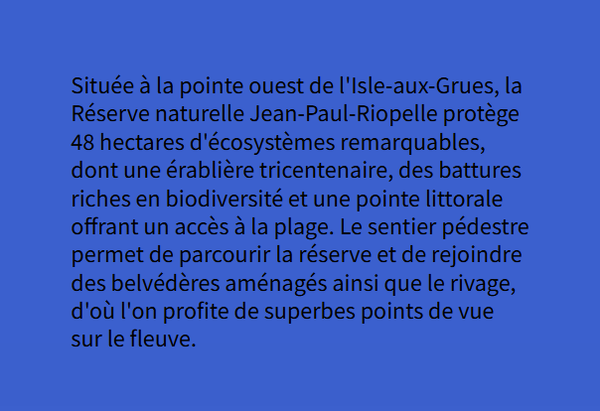 Attraits particuliers: érablière tricentenaire, réserve naturelle, belvédères, plage et circuit éducatif sur l'application Ondago (12 stations), station de la Route des plumes