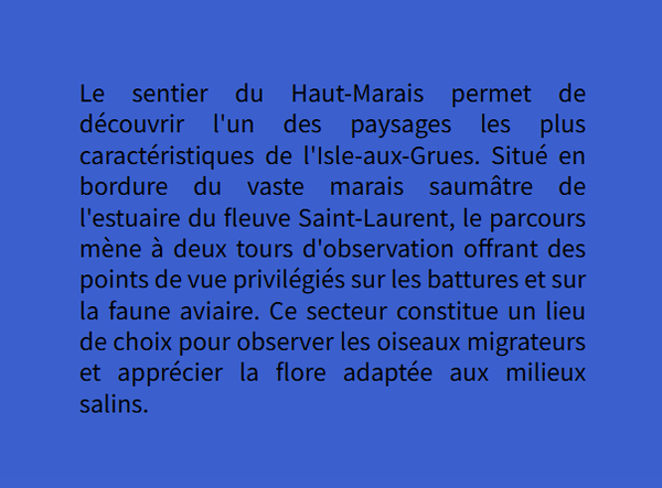 Marcher à l'Isle-aux-Grues, c'est ralentir et se laisser porter par les paysages ouverts de l'estuaire du fleuve Saint-Laurent. Entre marais, terres agricoles et rivages balayés par le vent, chaque promenade devient une occasion d'observer la faune, de découvrir une flore discrète et d'apprécier la lumière changeante qui façonne l'île au fil des marées.
