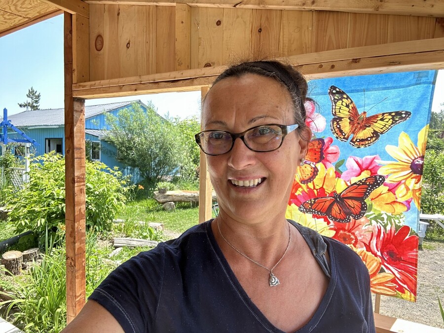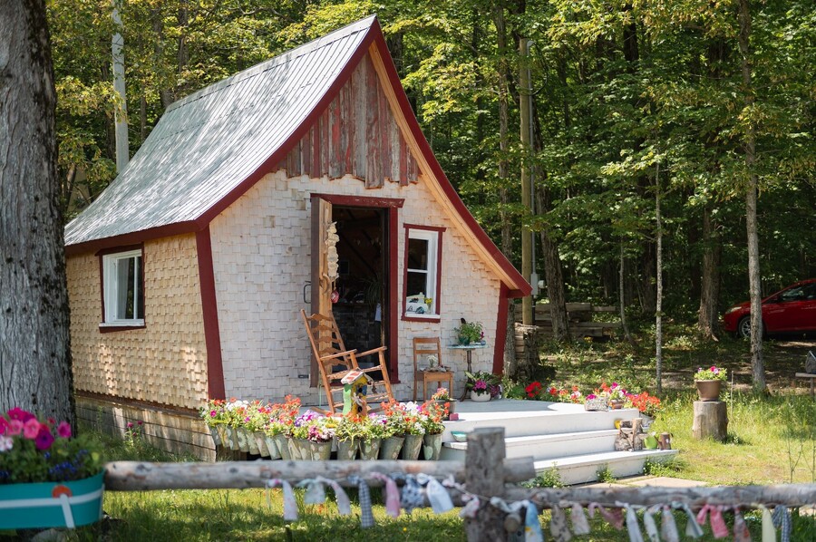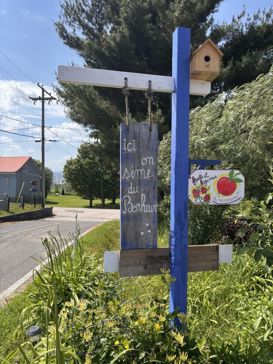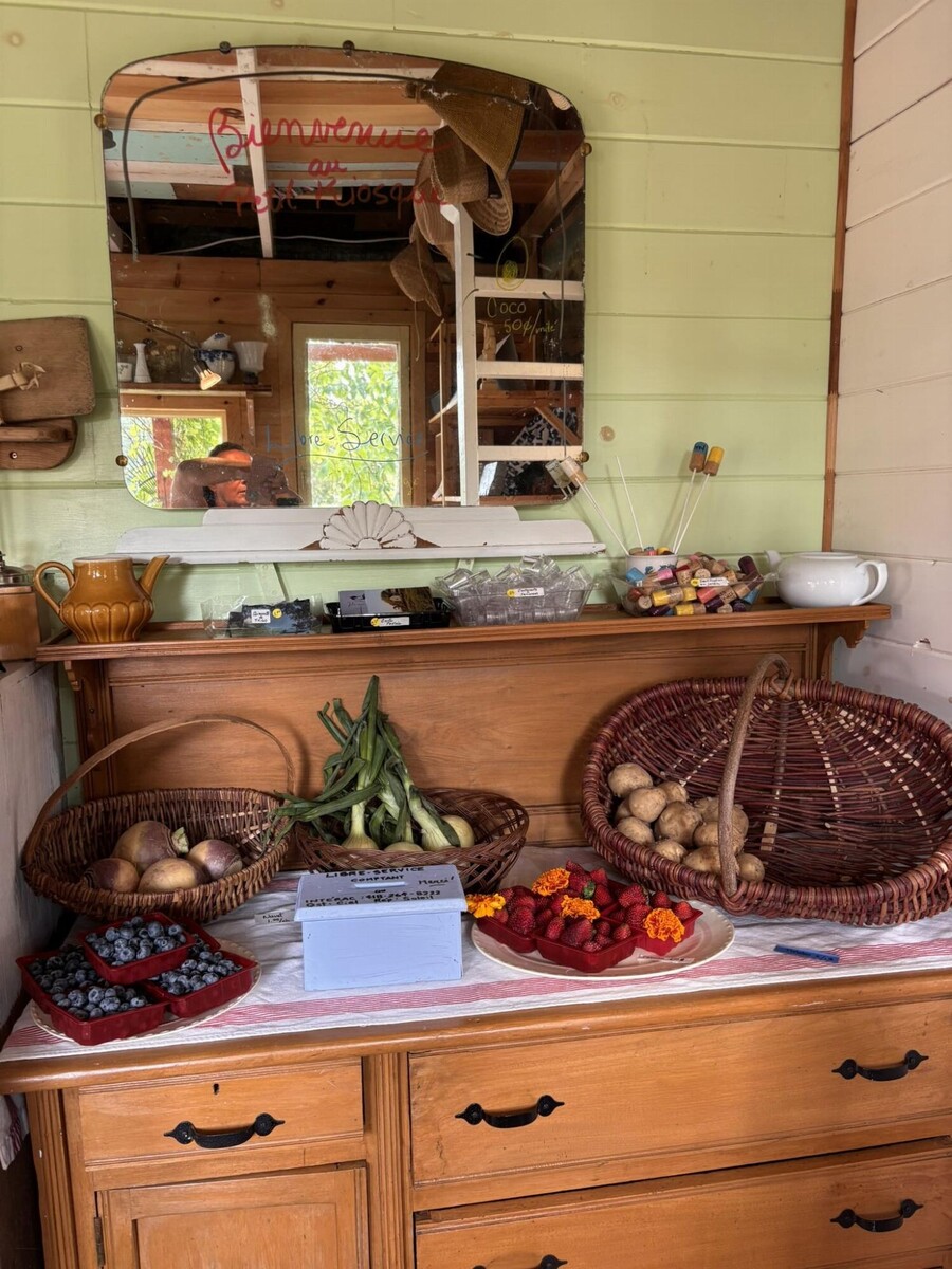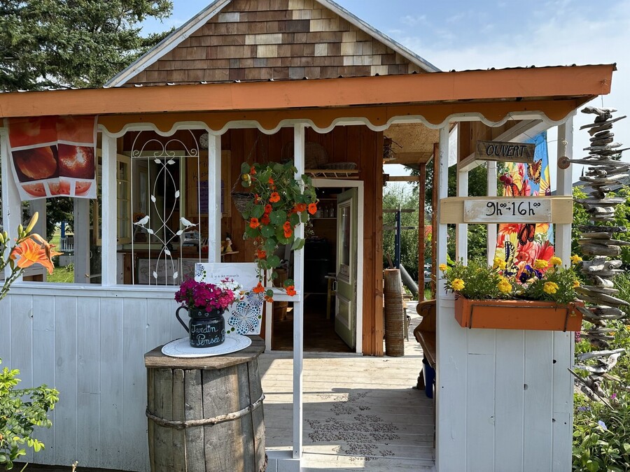 À l'entrée, poussez la porte du P'tit Kiosque du jardin pour vous procurer les productions potagères et fruitières du moment. La petite terrasse ombragée invite à faire une pause et à savourer la quiétude du lieu. Le kiosque est ouvert tous les jours de 9 h à 16 h, en libre-service, avec paiement comptant ou par virement Interac. En cas de fermeture temporaire, une affichette est placée à la porte et un numéro de téléphone permet de joindre Manon au besoin.