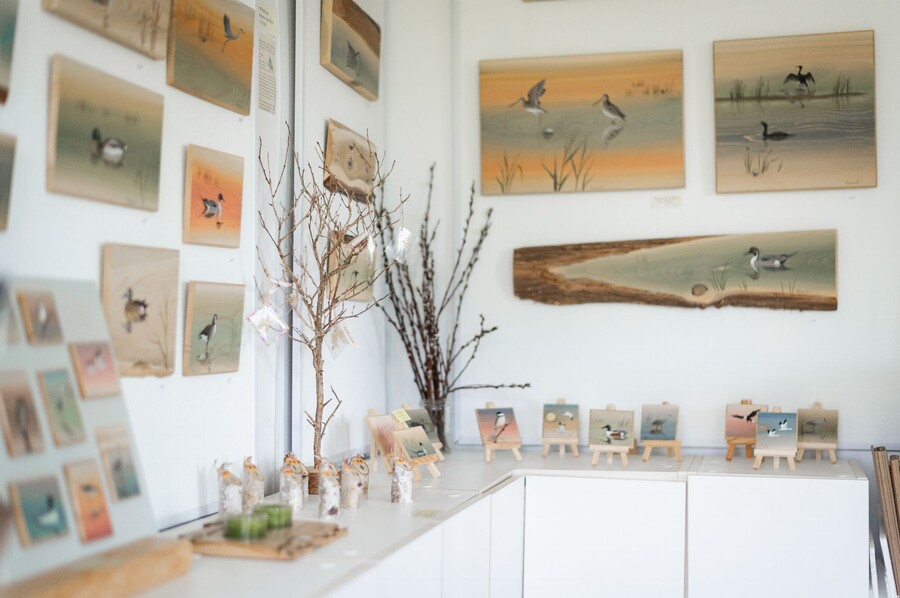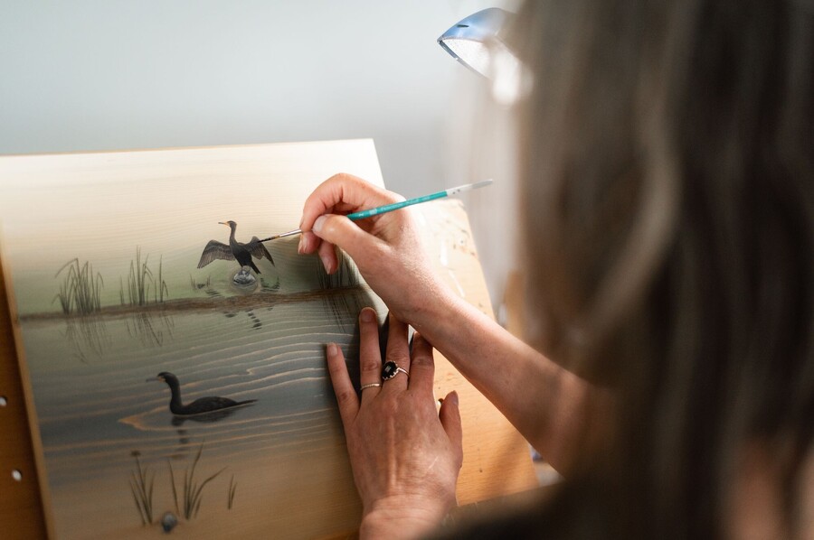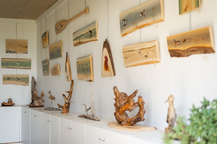 Une artiste gruoise d'adoption, amante de la nature, Odette Lapointe exprime son grand intérêt pour l'ornithologie. Elle a développé et raffiné une technique originale en s'inspirant du grain du bois pour créer des effets subtils, uniques à chaque pièce. Dans la boutique et l'atelier, vous trouverez des tableaux de différentes grandeurs, des miniatures, des supports pour clés, des cartes de souhait et d'autres produits. Ses oeuvres représentent une grande variété d'oiseaux, de mammifères et d'autres éléments reliés à l'eau.