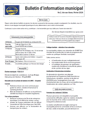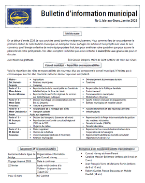 Les bulletins d'information municipaux visent à vous tenir informés des actualités, projets et décisions qui prisent mensuellement par le conseil municipal et qui concernent la communauté.