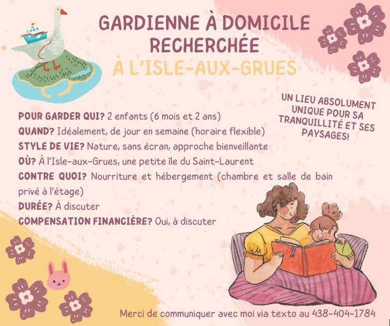Une famille souhaitant s'établir à l'Isle-aux-Grues est à la recherche d'une gardienne à domicile pour offrir du soutien et de la présence sur place.